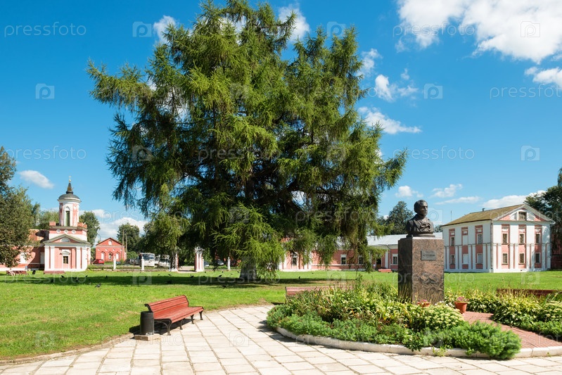 Волоколамск, Московская область, Россия - 9 августа 2021 года: Памятник Пушкину в усадьбе Гончаровых в деревне Ярополец