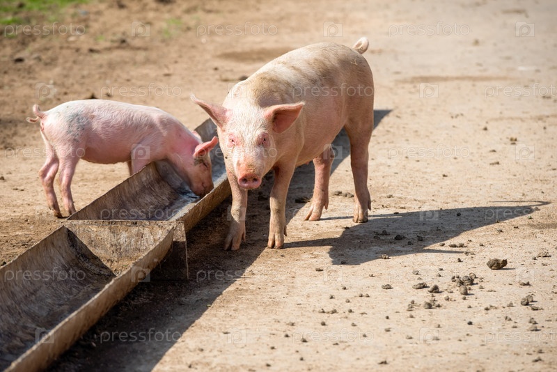 Маленькие поросята возле кормушки на животноводческой ферме в летний день