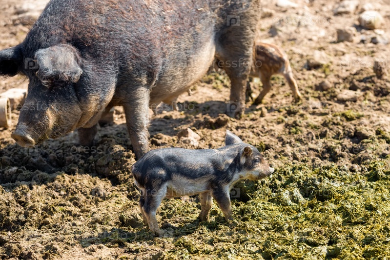 Мать-свинья со своими маленькими поросятами в загоне на ферме
