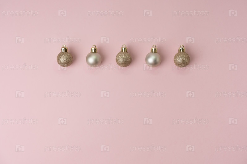 Рождественская композиция. Рождественские золотые украшения на розовом фоне. Плоская планировка, вид сверху, пространство для копирования