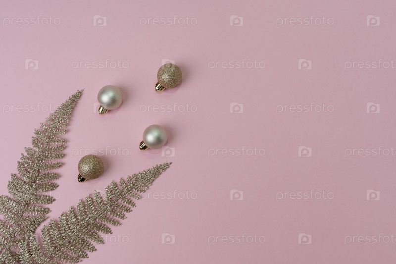 Золотое рождественское украшение на розовом фоне. Плоская укладка. Копировать пространство