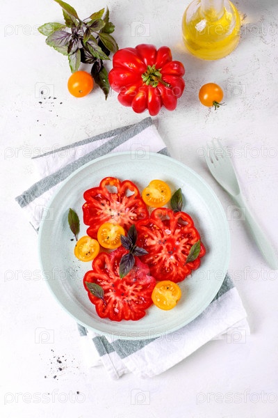 Салат из помидоров с красным гребешком, желтыми помидорами черри и базиликом, заправленный черной солью и оливковым маслом, подается на тарелке из пшеничной соломы. Вид сверху