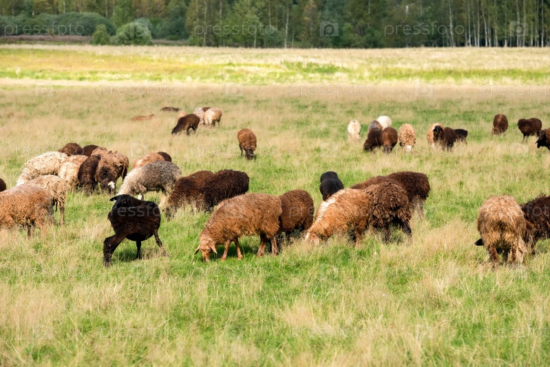 Стадо овец пасется на лугу в летний день
