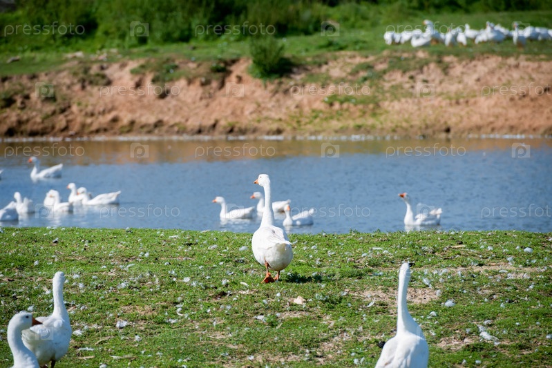 Белые гуси в летний день у фермерского озера