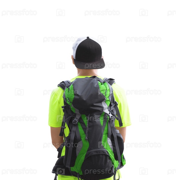 Вид сзади на молодого человека в походной одежде