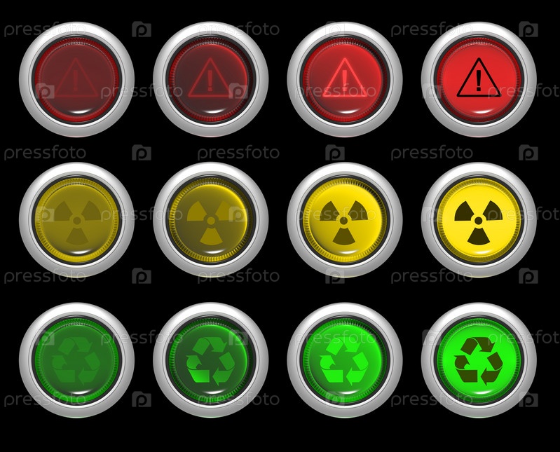Разноцветные кнопки с подсвеченными символами: радиация, переработка и внимание