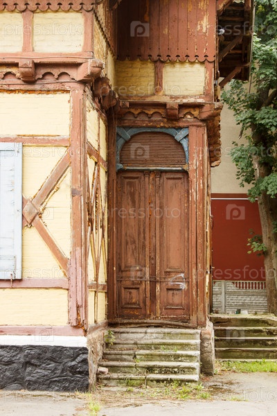 Входная дверь старого заброшенного дома на городской улице в летний день