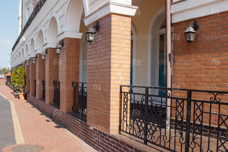 Декоративная кирпичная колоннада современного городского строительства в солнечный летний день