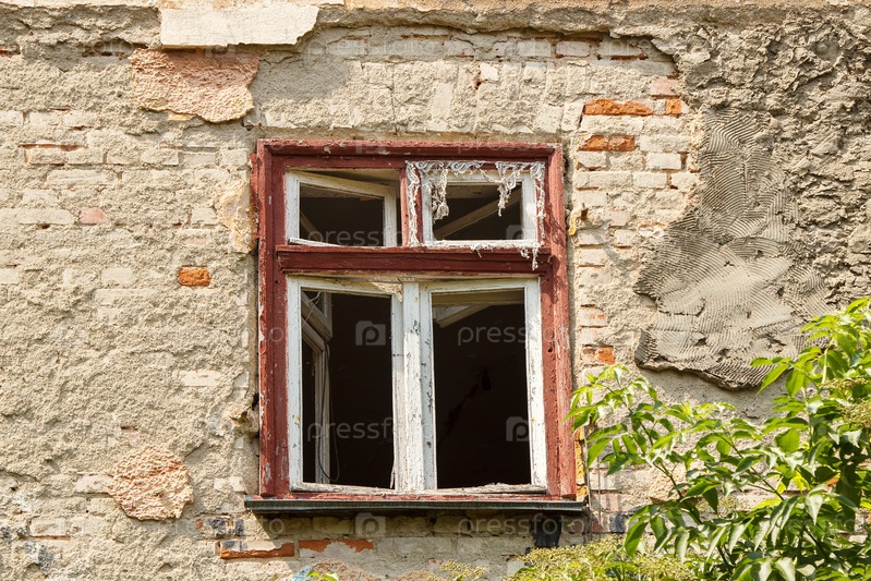 Окно старого заброшенного дома на городской улице в летний день крупным планом