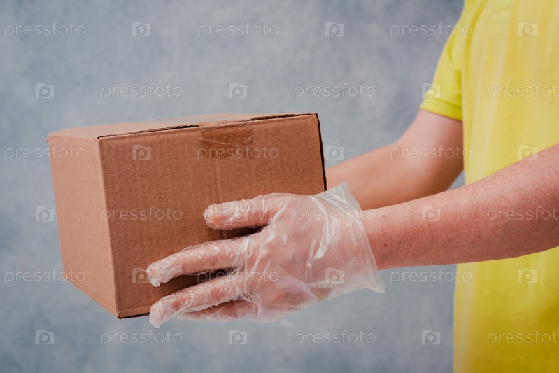 Курьер держит картонные коробки в одноразовых перчатках. Бесконтактная доставка в период карантина по коронавирусу