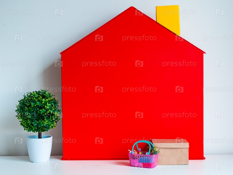 Красный декоративный дом с игрушечными посылками и продуктами. Доставка бесконтактных коробок и продуктов. Концепция бесконтактной доставки в период карантина по коронавирусу