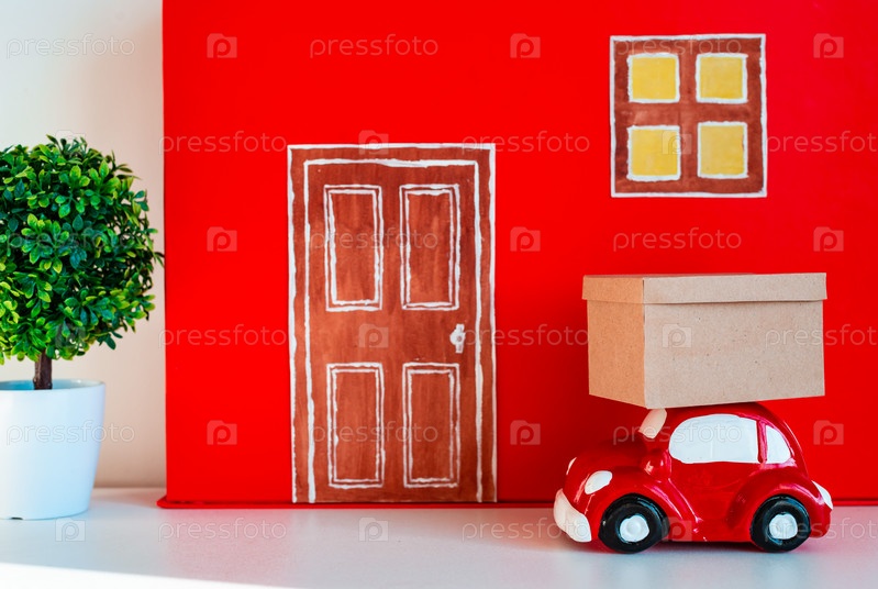Красный декоративный дом с игрушечными посылками и продуктами. Доставка бесконтактных коробок и продуктов. Концепция бесконтактной доставки в период карантина по коронавирусу