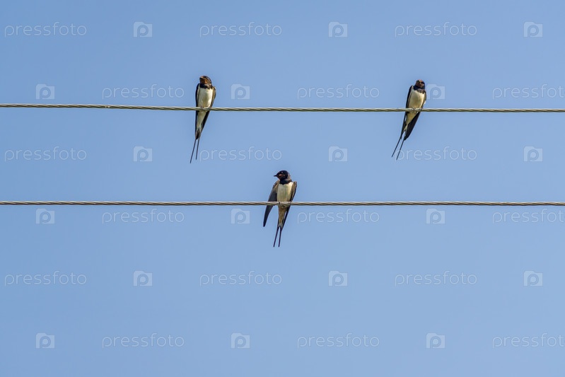 Ласточки сидят на проводах на фоне голубого неба в солнечный день
