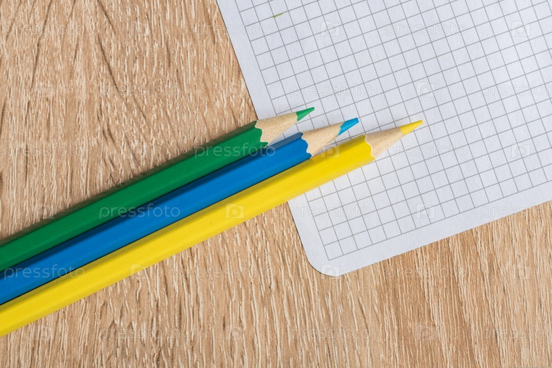 Три цветных карандаша и лист бумаги на деревянном столе