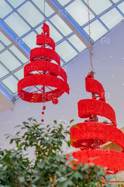 Красная рождественская елка и гирлянда висят на потолке крупным планом
