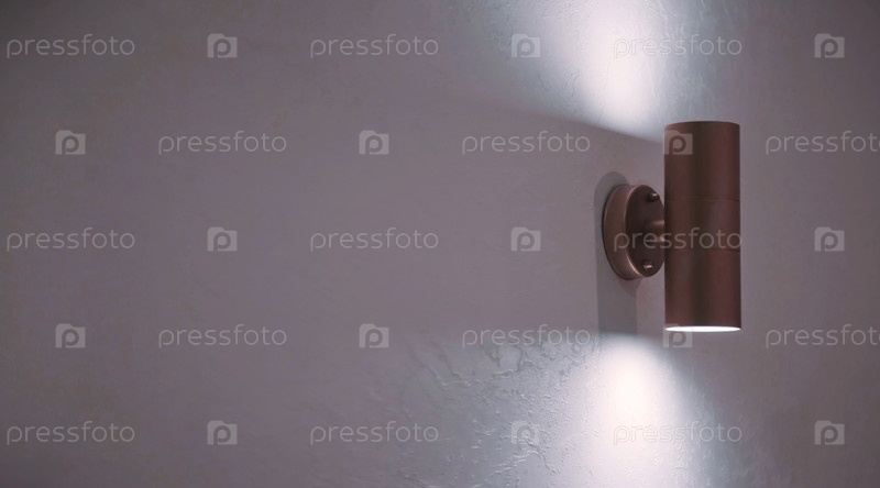 Стильная современная лампа на белой текстурированной стене. Светящаяся хромированная светодиодная лампа на серой стене. Свободное пространство и более темная полоса на фоне для надписи. Копирайт место для сайта или баннера