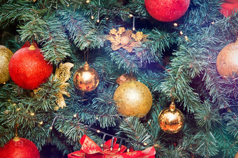 Крупным планом рождественский праздник фон украшенной елки