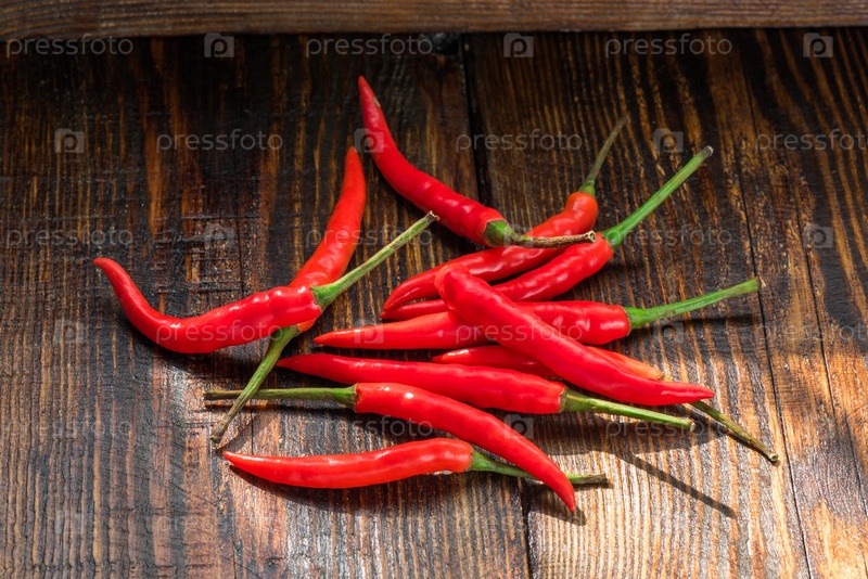 Куча тайского чили с птичьего глаза на старом деревянном столе
