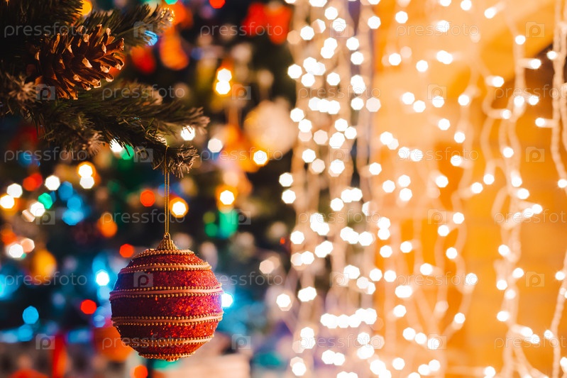 Рождественский бал висит на украшенной елке на фоне горящих огней боке ночью. Концепция поздравительной открытки с новым годом