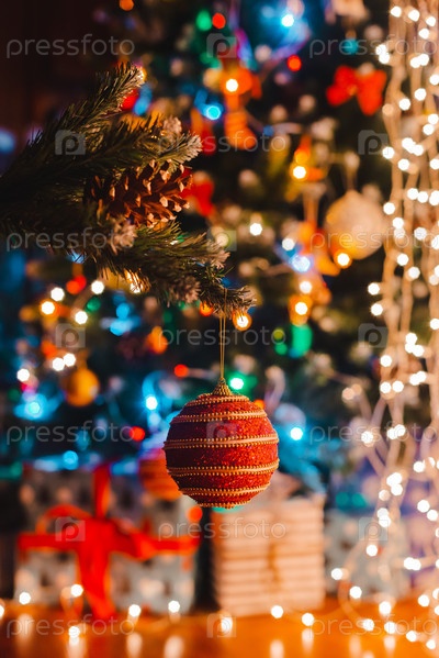 Рождественский бал висит на украшенной елке на фоне горящих огней боке ночью. Концепция поздравительной открытки с новым годом