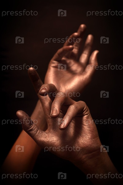 Мужские руки в бронзовой краске на черном фоне