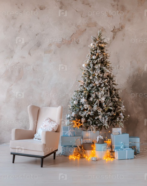 Рождественская украшенная елка с подарками и стулом на фоне стены в гостиной. Свободное место для текста
