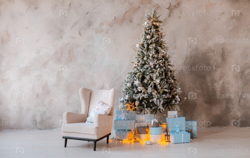 Рождественская украшенная елка с подарками и стулом на фоне стены в гостиной. Свободное место для текста