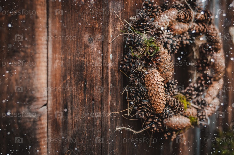 Праздничный деревенский венок из шишек на темно-коричневом деревянном фоне. Концепция праздника Рождества и Нового года