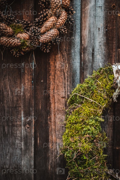 Праздничный деревенский венок из шишек на темно-коричневом деревянном фоне. Концепция праздника Рождества и Нового года