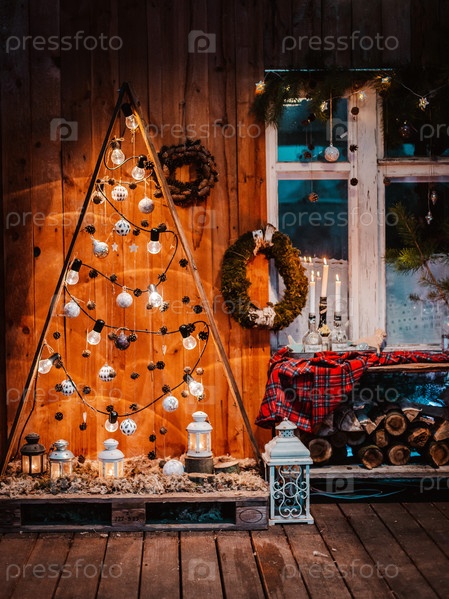 Зимний экстерьер загородного дома с рождественскими украшениями в американском стиле. Заснеженный двор с крыльцом, деревом, белой скамейкой и деревянными старинными санями