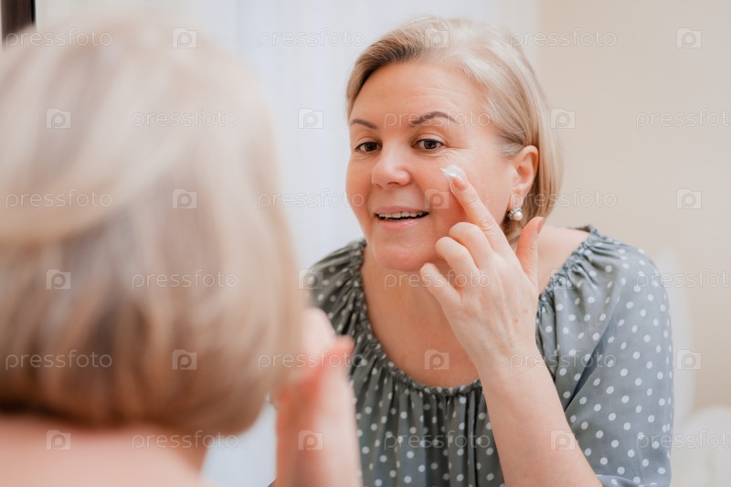 Счастливая здоровая зрелая женщина у зеркала наносит антивозрастной увлажняющий косметический крем на лицо, улыбающаяся дама средних лет, мягкий уход за чистой кожей и красота