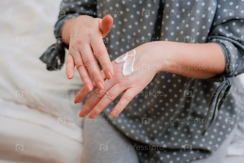 Счастливая здоровая зрелая женщина наносит на руки омолаживающий увлажняющий косметический крем, улыбается даме средних лет с мягким чистым уходом за кожей и красотой дома