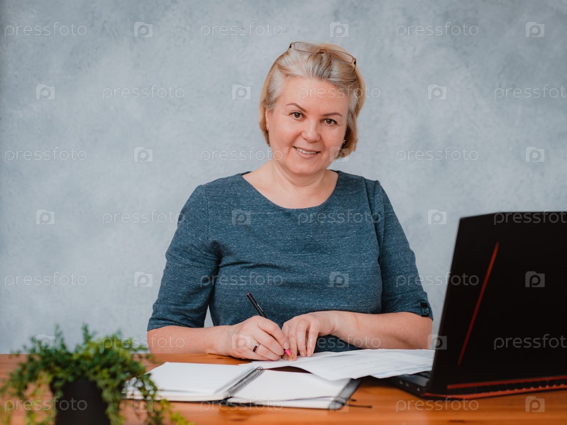 Портрет красивой деловой пожилой женщины на сине-сером фоне, смотрящей в камеру с ручкой