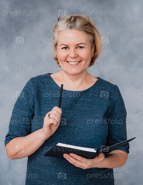 Портрет красивой деловой пожилой женщины на сине-сером фоне, смотрящей в камеру с ручкой