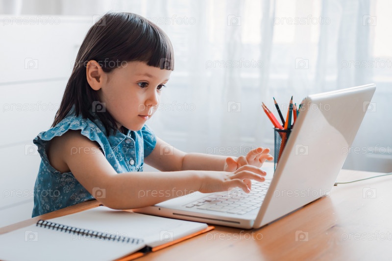 Дистанционное обучение онлайн образование. Девочка дома и делает домашнее задание. Домашнее дистанционное обучение