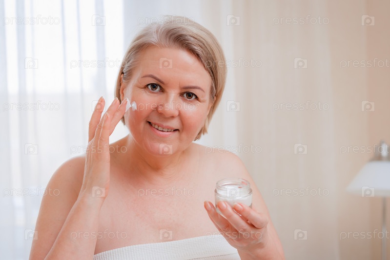 Улыбающаяся пожилая женщина наносит антивозрастной лосьон для удаления темных кругов под глазами
