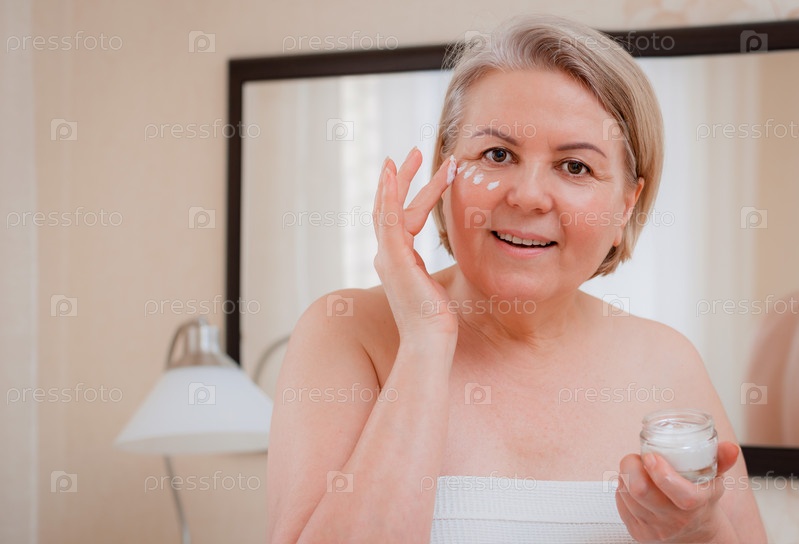 Улыбающаяся пожилая женщина наносит антивозрастной лосьон для удаления темных кругов под глазами