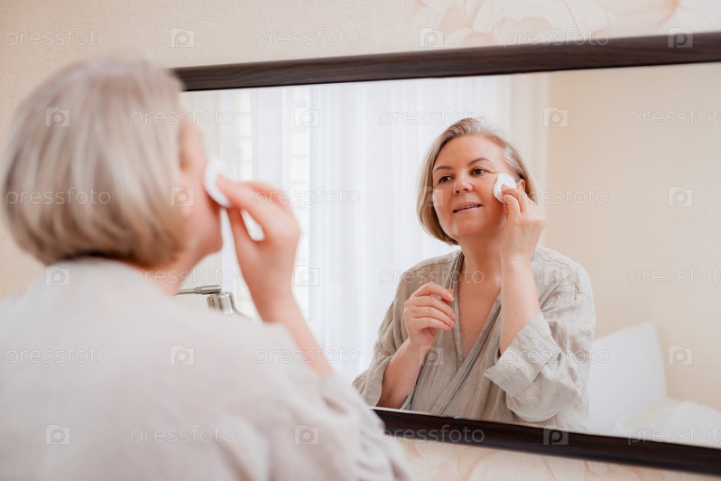 Портрет симпатичная пожилая женщина с руками на зеркале дома после ванной Уход за кожей после 50-60 лет