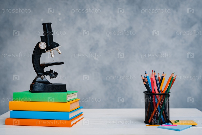 Стопка красочных учебников и стакан ярких карандашей на серо-голубом фоне. Концепция образования, обучения, рабочего пространства, свободного пространства