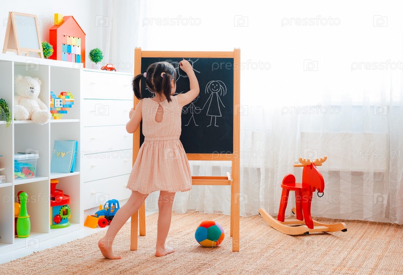 Девочка стоит в детской комнате с доской и рисует мелом семью