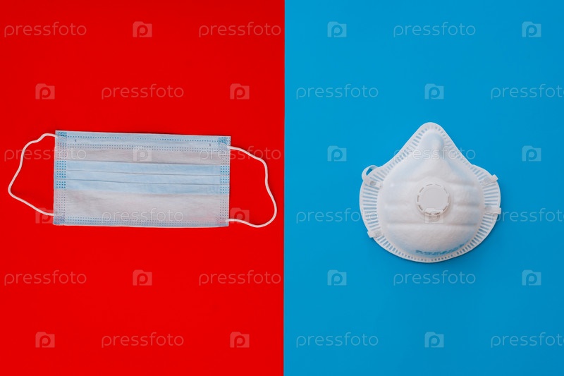 Белая разновидность медицинской маски и респиратора на сине-красном фоне. Маска для лица защищает от загрязнения окружающей среды, вирусов гриппа и коронавируса. Здравоохранение и хирургическая концепция