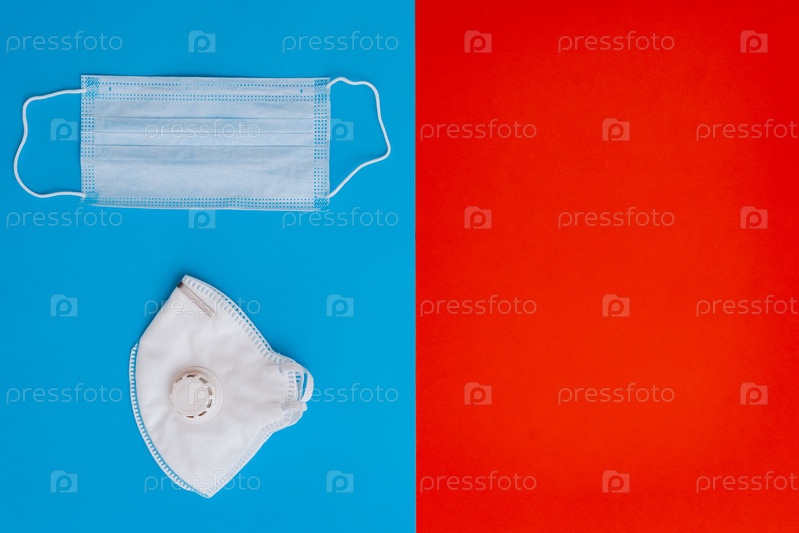 Белая разновидность медицинской маски и респиратора на сине-красном фоне. Маска для лица защищает от загрязнения окружающей среды, вирусов гриппа и коронавируса. Здравоохранение и хирургическая концепция