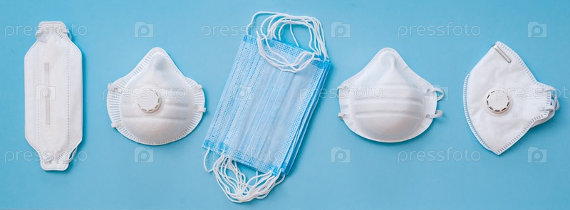 Респиратор маски белого сорта на синем фоне. Маска для лица защищает от загрязнения окружающей среды, вирусов гриппа и коронавируса