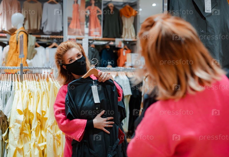 Красивая женщина в ярко-розовое пальто в торгового центра с черной защитной маской на лице