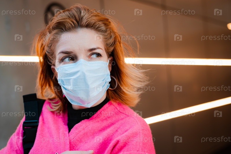 Европейская женщина носит хирургическую защитную маску для лица от инфекционных заболеваний