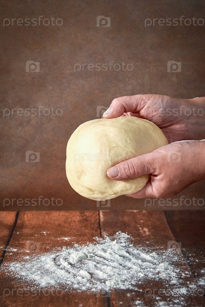 Руки пожилой пухлой женщины месят тесто на деревянном столе. Приготовление теста для праздничного торта, пиццы