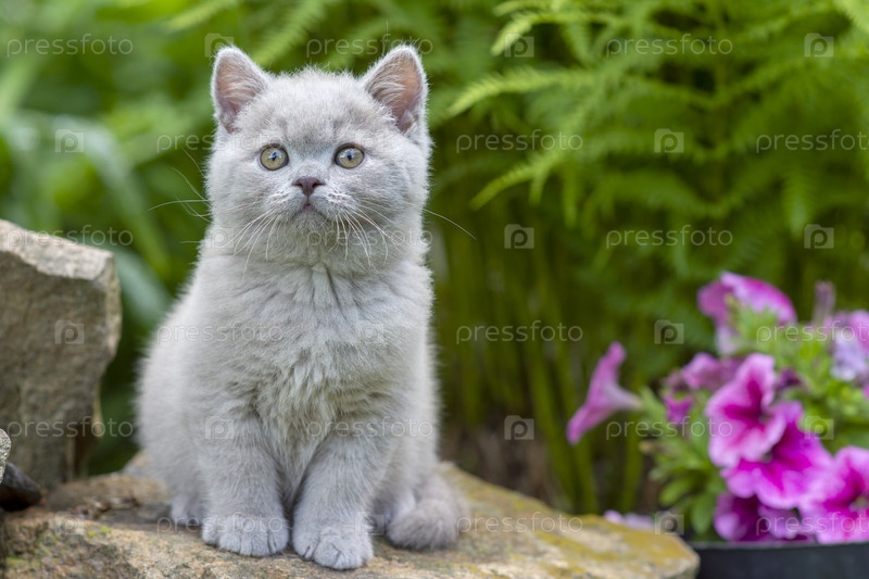 Британский короткошерстный котенок сидит на камне в траве крупным планом