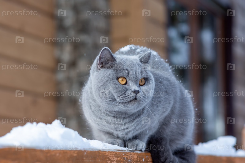 Домашняя кошка британской короткошерстной породы с желтыми глазами в снегу, серая британская кошка сидит на перилах загородного дома на улице морозной зимой