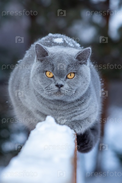 Серая британская кошка сидит на перилах загородного дома на открытом воздухе морозной зимой