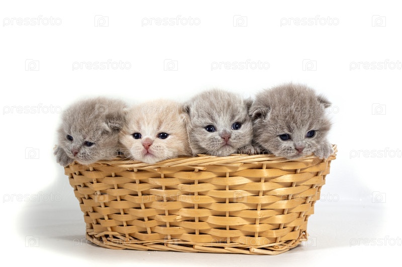 Четыре маленьких британских котенка сидят в плетеной корзине. Изолированные на белом фоне